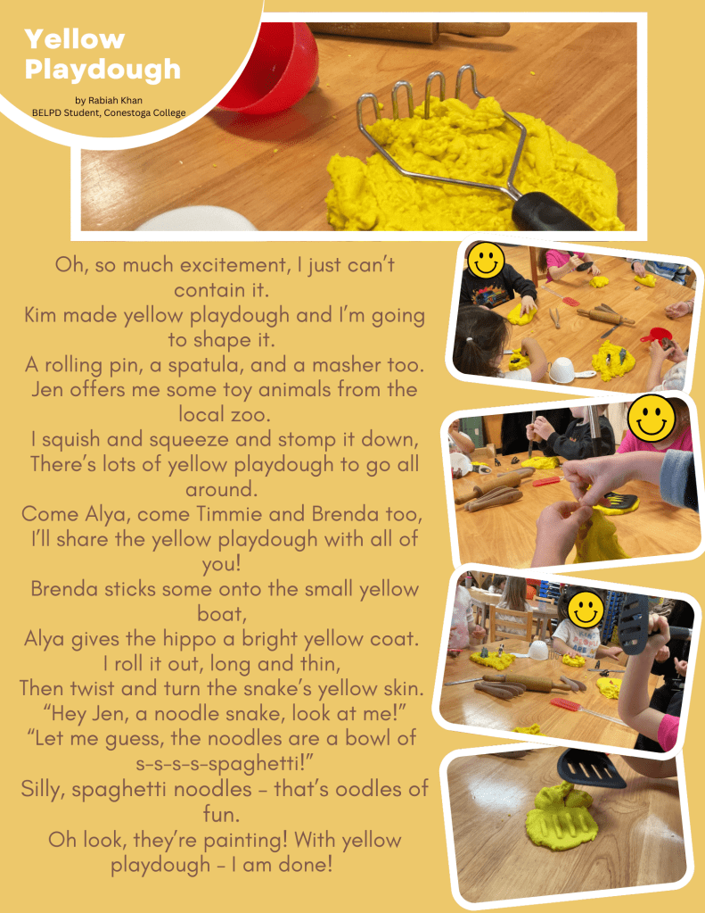 My field placement center implements a child-led pedagogical approach, offering invitations and provocations based on the children’s interests and inquiries. The Yellow Playdough Poem documentation offers a snapshot of the children’s interest in playdough and how they engage with it. This documentation can be used by the educators in planning future activities and scaffold children’s learning based on their interest in sensory and hands-on play. Offering other mediums, such as slime, clay, oobleck and goop, or adding other textures like sprinkles, little beads, or glitter, can enhance the children’s sensory experience and extend their learning through open-ended questions about the attributes of different materials and textures. A short poem about some yellow playdough can be an insightful piece of documentation with the potential to add much value for all those who engage with it.